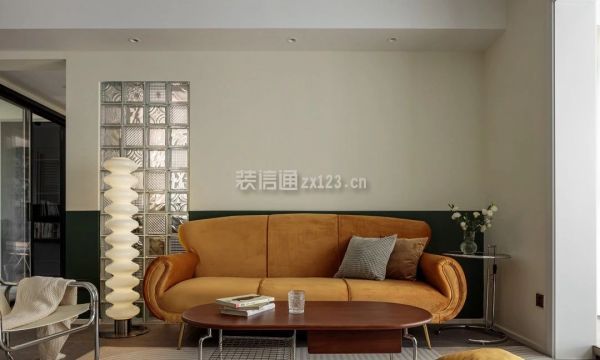 在沙发背景墙巧用玻璃砖可增加空间的通透感,设计师在选砖时,特意选了不同的肌理效果混合安装,让空间看起来复古又特别,搭配落地灯形成视觉落脚点,让每次归家都更具仪式感。